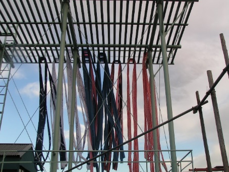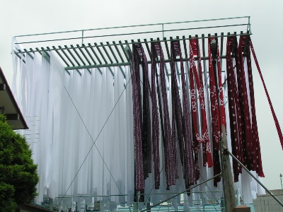 水洗後の生地を遠心脱水機で脱水し、櫓(やぐら)にて自然乾燥をする。