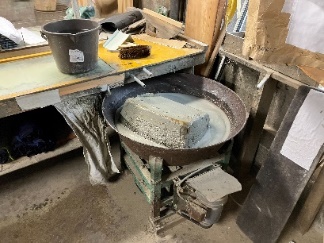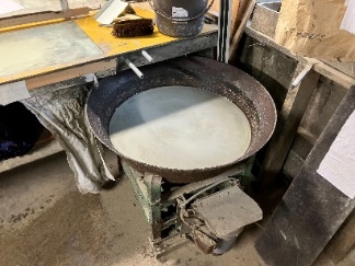 左上に見えるのが型付け台であるが、この糊の撹拌機で調合された糊をヘラで掬って型付けをする。