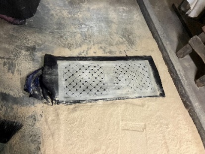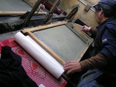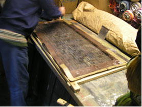 ![]() (2)型枠を布の上に降ろし、糊をこすりつけます。