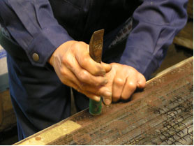 ![]() 鋲を鋲打ちで打っているところ。