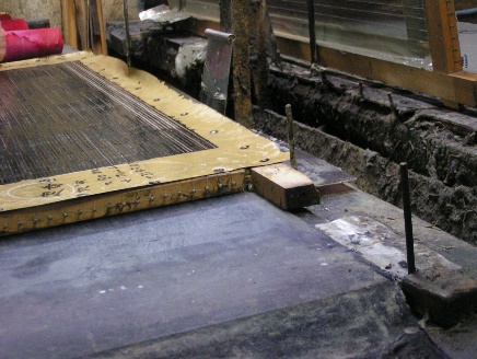 ![]() 木枠に固定された型紙は、型付台の上で糊の型付に使われます。