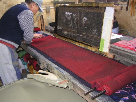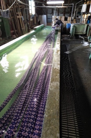 一度、染めあげ、水洗、乾燥させてから、再度型付けと染めを繰り返し、多色染めする、大変手間のかかる技法。