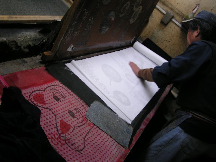 ![]() 布の汚れ防止の為、本番の布に型付する前にすて布に二度の型付をします。