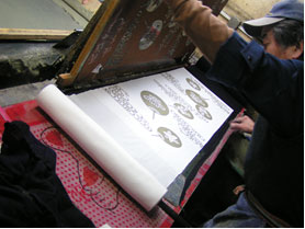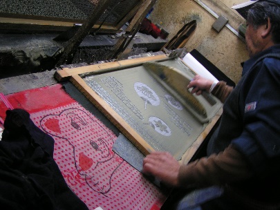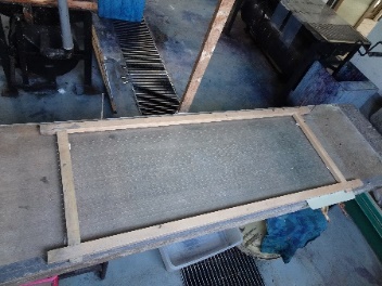 ![]() 型紙を水につけて、柔らかくしなやかにし、木枠のテグスと型紙の紗が接するようにして、鋲で木枠の四辺に止めつけます。