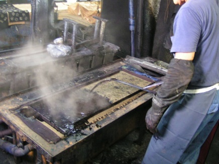 ![]() 型付が済み、おが屑をまぶした生地を注染台の上に置き、
