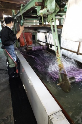 | ⑧ | 水洗 | 水洗機 | 染色された生地に付着した糊と未固着の染料を、水のみで洗い落とす。
