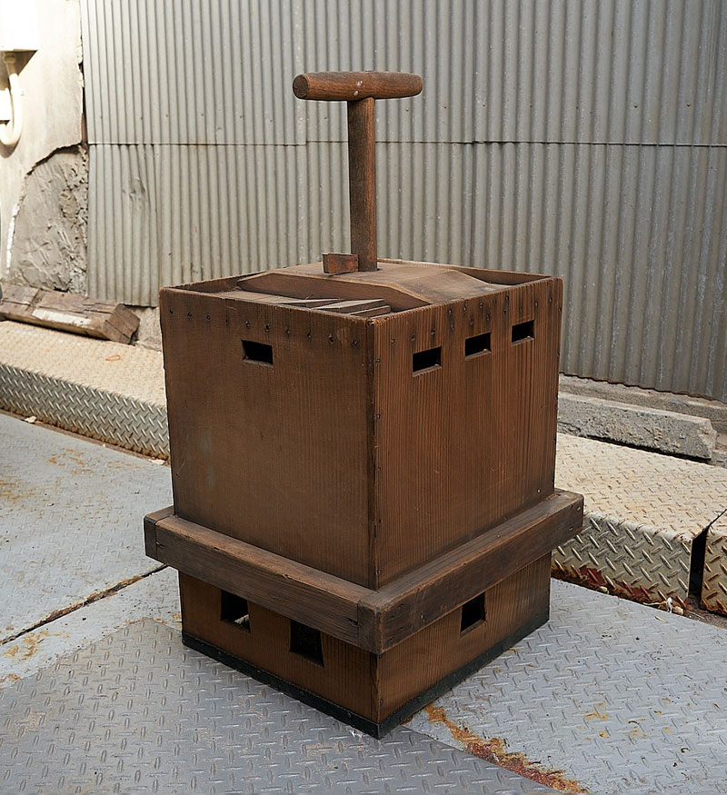 100年以上前は、木の樽の中に糊等の材料を入れ、人の手で棒で攪拌していた。 |