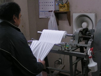 ![]() 左の人が生地の端を持ち、モーターで回転する棒に巻き取る。