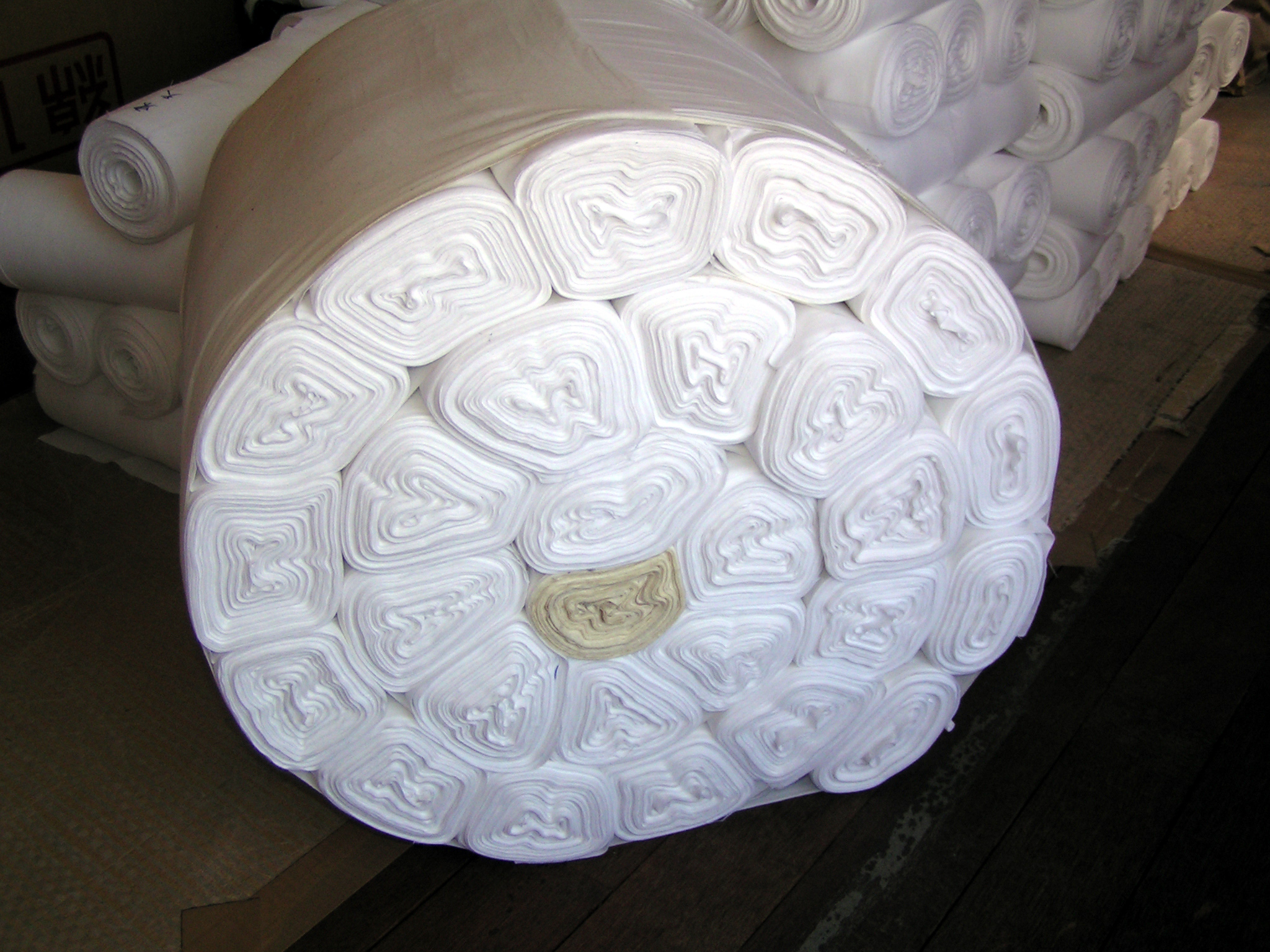 丸巻にした反物を数十個まとめたところ。 ※この工程は、100年以上前には、人の手で巻いていた。 |