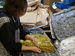 畳んだ状態で納品された晒生地の畳みシワを取り除くために行う。
