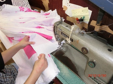 その後てぬぐいの長さにハサミで切り落とし、適度な大きさに畳み製品とする。
