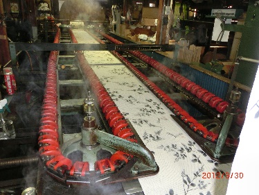 整理機 | 染上がったゆかた生地を再度湿潤・乾燥させシワを除去し、薄のりを付けた後、整理機(テンター)で生地の幅を整える。