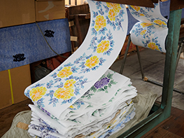 一度、染めあげ、水洗、乾燥させてから、再度型付けと染めを繰り返し、多色染めする、大変手間のかかる技法。